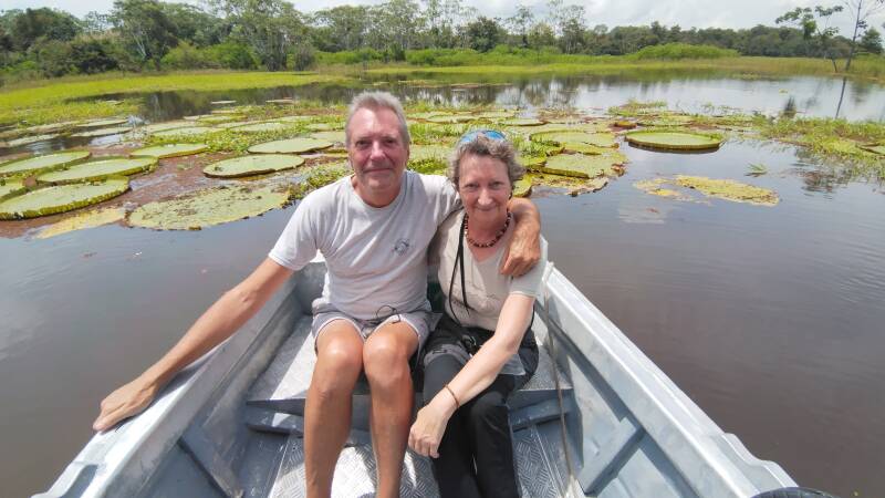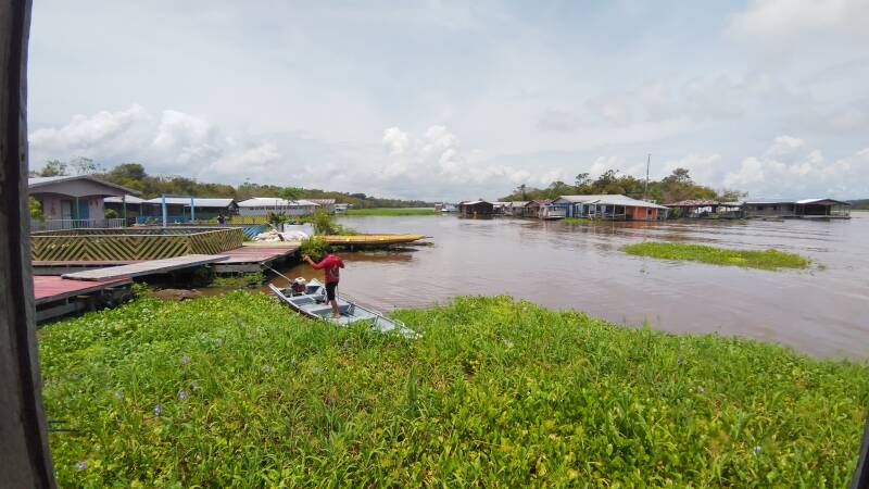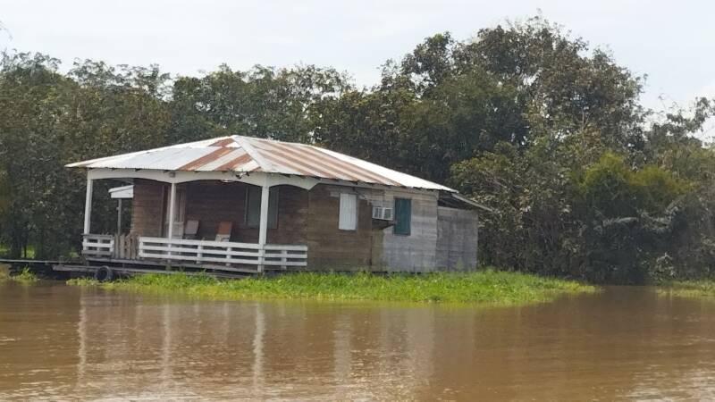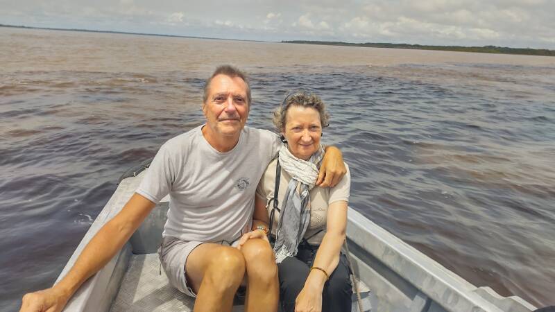 Après un parcours en parallèle dans la forêt Amazonienne, le Rio Negro et l'Amazone se rejoignent sans se mélanger tout de suite créant un effet spectaculaire de deux fleuves qui coulent ensemble sur 20 kilometres. Le Rio Negro coule a 2km/h, à une température de 26 degrés, l'Amazone à 5km/h, à une température de 20 degrés. Au moment où nous arrivons, c'est la saison des pluies et l'Amazone est déjà bien haute, elle sera à son maximum en juillet inondant une grande partie de l'Amazonie.