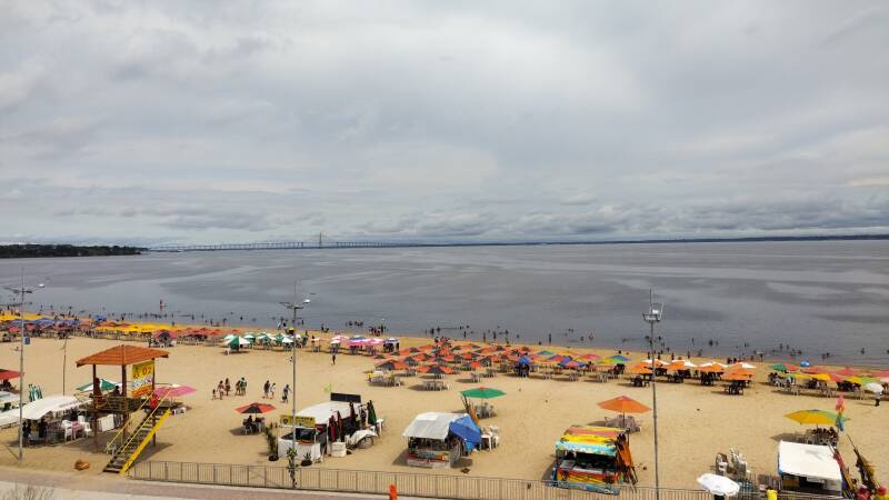 Sur la place principale nous sommes abordé par un policier de la brigade touristique, il parle un peu français, il a passé 8 mois à Strasbourg avec son travail. Nous prenons un Uber pour Ponta Negra, la plage des habitants de Manaus située sur le Rio Negro, très déçu, rien de particulier, une petite plage ordinaire. Nous y rencontrons Italo, un Bresilidn parlant français, très sympathique. Il a étudié en Suisse de 14 ans à 19 ans et est retourné vivre à Manaus. Il nous invite à venir manger à la maison oû sa femme nous attend. Ils sont âgés de 28 ans