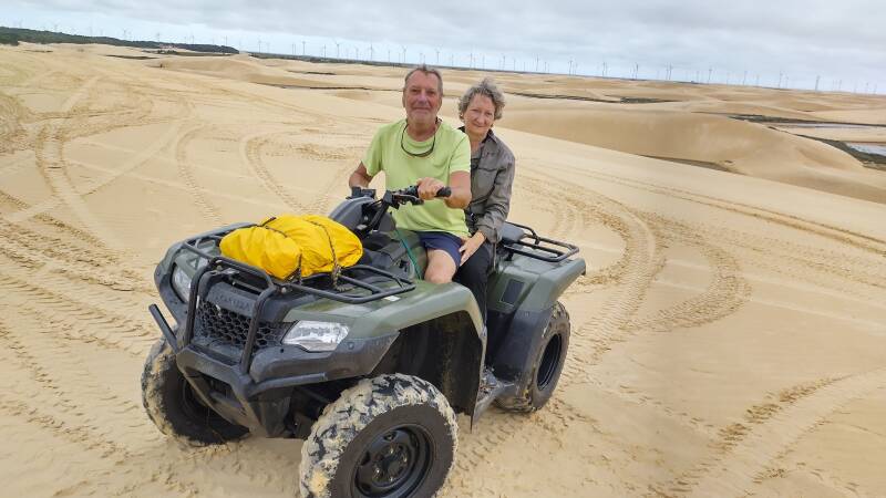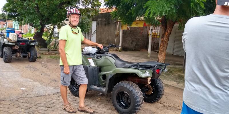 8h30, la grande aventure commence. Après une courte initiation, nous partons en Quad pour 90km à travers forêt tropicale et désert du Lencois. Les fortes pluies de la veille on créée des trous d’eau un peu partout sur les sentiers. Marie France à l’arrière. Le quad est confortable et puissant. Les trous d’eau même profond et les fortes dunes se passent sans difficulté.
