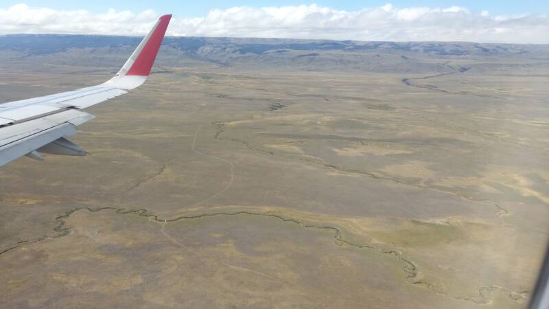 Nous prenons notre avion  avec Latam pour Balmaceda, petit aéroport de Patagonie, 155 euros pour deux. Depuis l’avion nous apercevons les steppes arides. Il n’y a rien à Balmaceda à part l’aéroport et quelques maisons, pas de transport pour notre destination  Puerto Tranquilo, nous devons dormir dans la ville la plus proche à Coyhaique. Un minibus nous emmène pour 20 euros les deux, en 50 mn, 52 km. Il nous dépose devant l’hostal Casa Arrayan. Le temps est bien plus froid, 7 degrés et il pleut un peu. Depuis que nous sommes  en Patagonie, très peu d’hotel comme en Europe, mais plutôt des auberges ou Airbnb. Tout le monde à transformé sa maison en hostal ou cabanas à des prix assez élevés. Il faut souvent parlementer pour ne pas payer la TVA de 19%, en tant que touriste étranger.