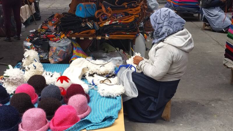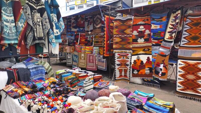 Otavalo, petite ville sympathique, très vivante avec son marché de laine d’Alpaga, panchos, gilets, tapis, chapeaux. Nous acheterions tout, tellement c’est beau, mais nous voyageons léger.