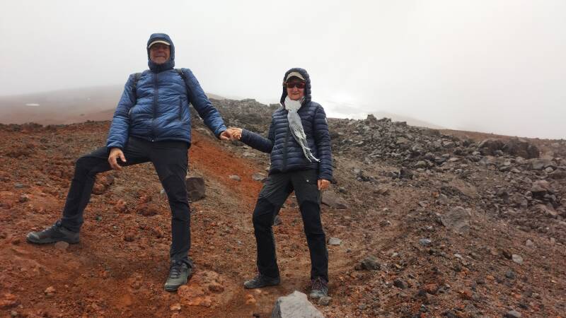 Départ 8h avec notre guide, tour de la lagune pour s’habituer à l’altitude à 4000m, 4x4 jusqu’a 4600m puis marche à pied en terrain difficile jusqu’au refuge à 4864m, neige et froid étaient de l’aventure. Nous continuerons jusqu’à 5000m. Retour au refuge pour un chocolat bien chaud et un petit casse croute.