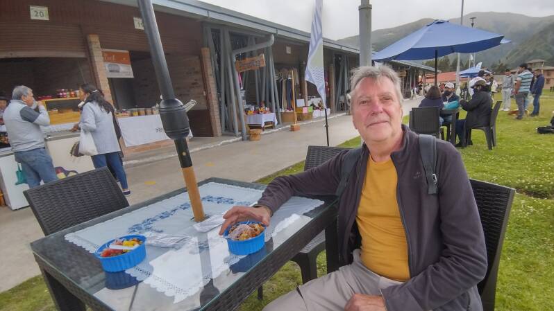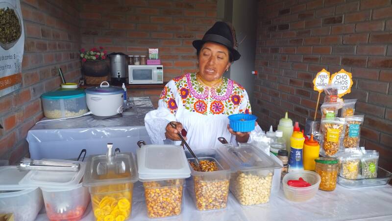 Village à 1h d’Ibarra en bus, sur les flancs du volcan Imbabura à 3000m d’altitude, les habitants brodent toujours à la main. Nous en profitons pour faire une petite balade et déguster sur une petite fête du Janchi, spécialité à base de viande de boeuf, tomates, patates, mais, oignons.