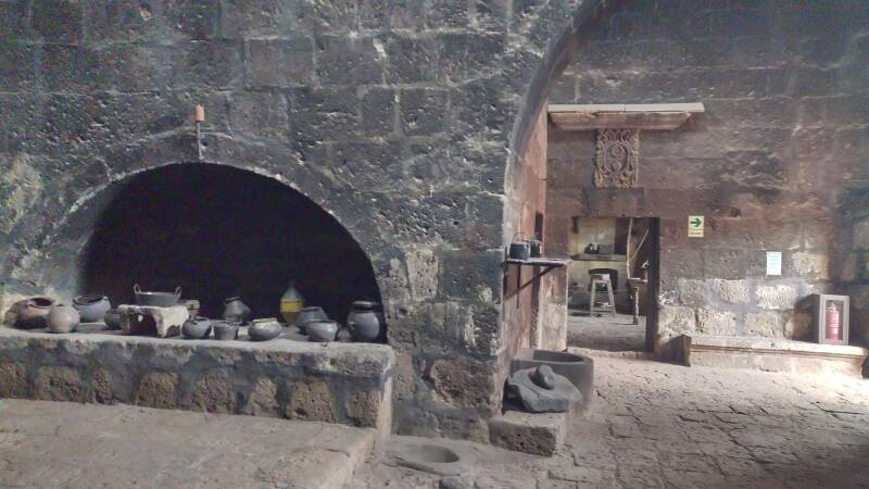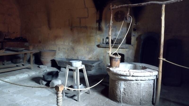 Ensuite la rue de Burgos, toujours de rouge vêtue, mène à la salle commune, qui servait d'église jusqu'à la réforme de 1871, où étaient stockées les provisions, et attenante à la grande cuisine. Les siècles de fumée ont assombri cette pièce.