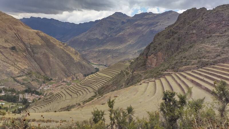 Le versant de la colline est strié de terrasses agricoles construites par les Incas et toujours utilisées, montrant comment les incas ont réussi à mettre en culture les pentes abruptes des montagnes.