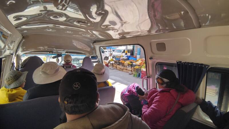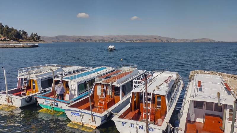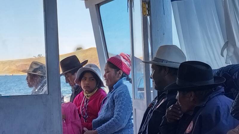 Marie-France étant fiévreuse, un petit coup de froid, nous rendrons sur Puno pour se reposer. Nous apprenons sur les médias que la trêve de la grève pour les fêtes est rompue par les villages Aymaras du sud de Puno, les routes vers la Bolivie sont bloquées sur une durée illimitée. Nous allons au terminal de bus, les bus sont bien supprimés, le billet est remboursé, on nous conseille de se rendre au port pour prendre un bateau pour Kasani à la frontière bolivienne. Nous faisons marcher la concurrence et nous obtenons un billet le 29 décembre pour 160 soles, 40 euros pour deux, 5 heures de traversée.