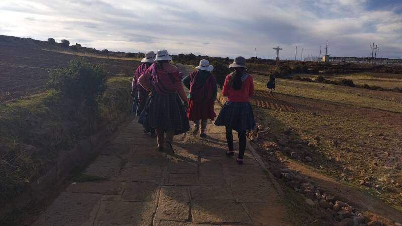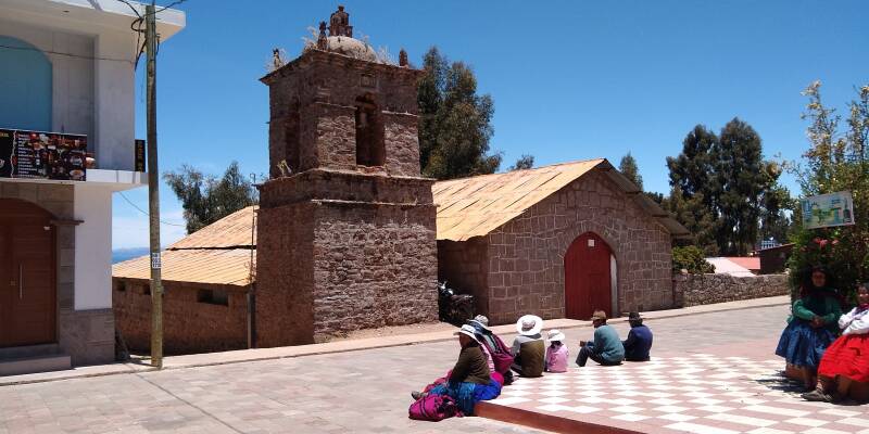 L’église catholique et l’école primaire. La messe est obligatoire tous les dimanches. Les enfants ne vont qu’à l’école primaire, il n’y a pas de maternelle. Le collège est à Puno, ils prennent le bateau à 6h30 et reviennent à 15h.