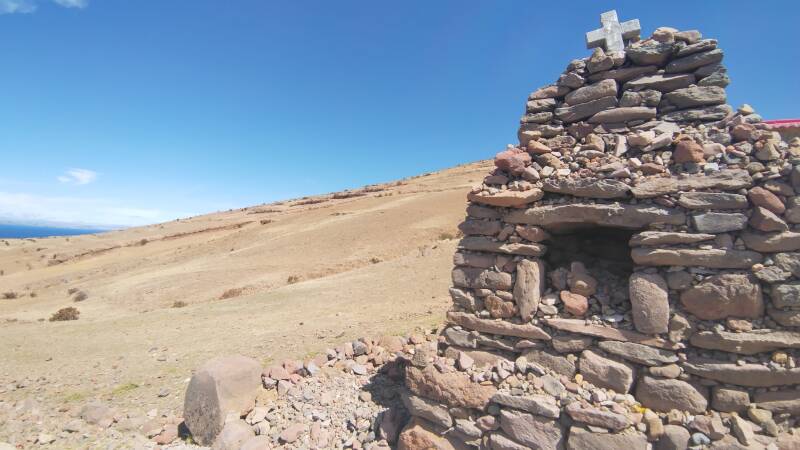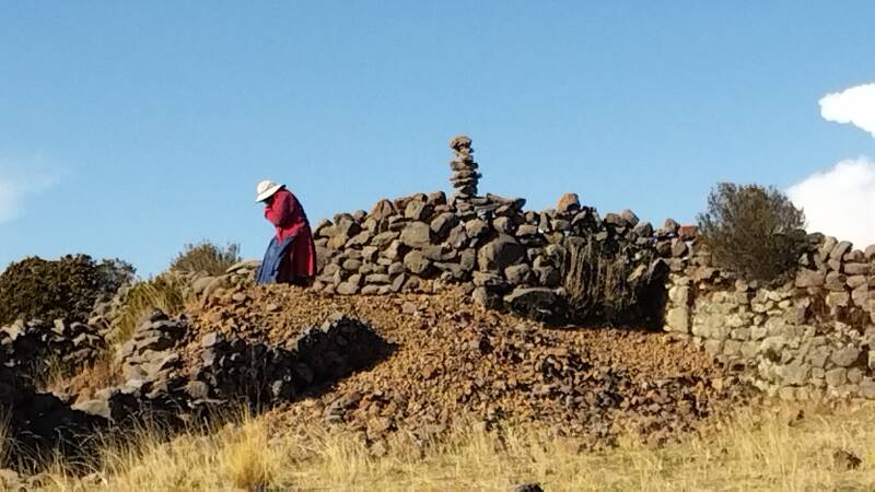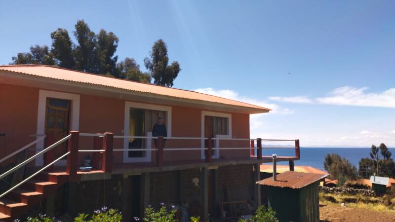 Ivan nous attend à l’arrivée, il habite à côté de la place principale, il n’est pas très bavard. Il  nous fait visiter son petit village, il y a une école et un centre de soins mais aucun spécialiste ni dentiste. Il vite en autonomie et vont une fois par mois sur le continent pour acheter ce qu’il leur manque, fruits, riz, huile, hygiène. Il cultive un petit lopin de terre aride pour leur consommation personnelle, ils ont quelques poules et moutons. La famille d’Ivan est sur l’île depuis 4 générations, il vit avec sa femme, sa belle mère et deux enfants de 18 et 7 ans. Les repas sont simples mais copieux, soupe de légumes puis fromage frit riz tomates patates. La chambre est simple, pas de douche et de chauffage. Il fait assez froid la nuit, entre 6 et 8 degrés,  mais il y a assez de couvertures pour le lit. La grève a fait fuir tous les touristes, ils n’ont plus de revenus, nous seront les deux seuls touristes pendant ces 2 jours. La chambre avec petit déjeuner, déjeuner et dîner, 140 soles, 35 euros.