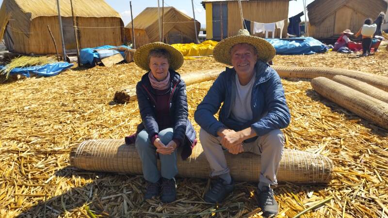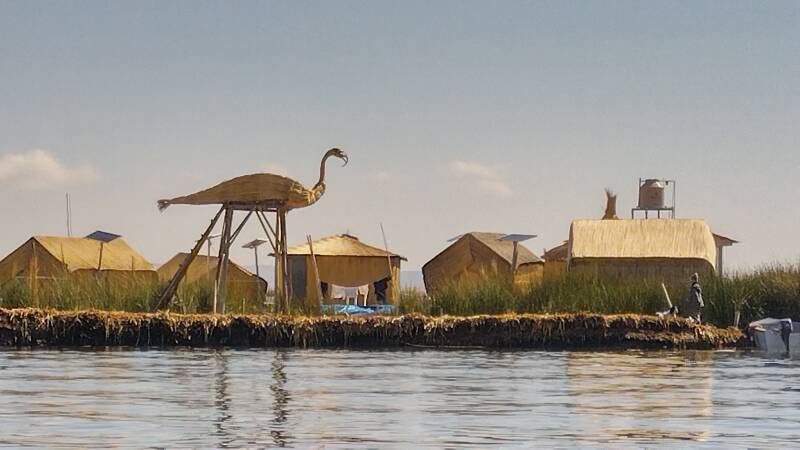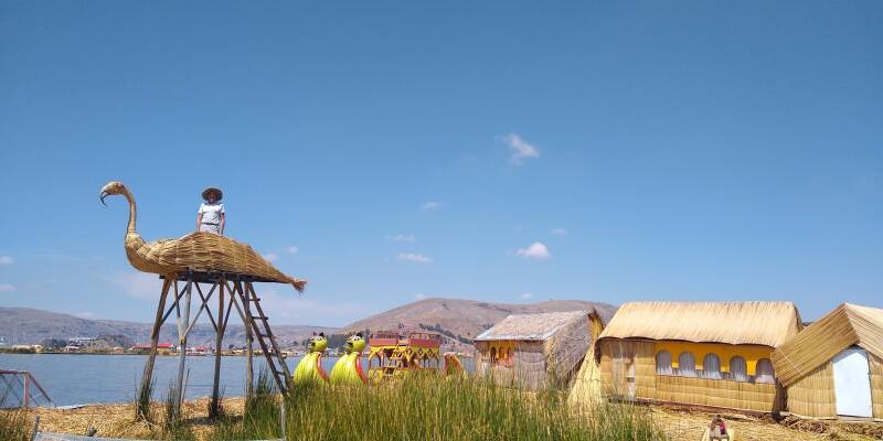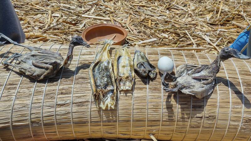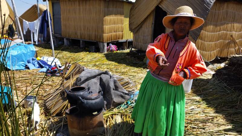 Nous sommes accueilli par sa maman. Richard nous explique la fabrication de son île, il y à 8 mètres de fond. A 15km de là ils vont découper des blocs de terre dans le lac, les rapporter à l’endroit oû ils veulent construirent leur île. Les blocs sont ficelés entre eux et plonges dans l’eau, ils flottent. Ils les recouvrent de totoras, sorte de roseau qui poussent dans le lac. La totora est utilisée pour la construction de l’île, les maisons, le bois pour la cuisine. Une fois l’île construite, 1 mette de terre flottante et 1 mètre de totora, ils construisent les maisons, la cuisine est posée sur une pierre pour éviter l’incendie. La totora pourrie rapidement, tous les 15 jours, ils doivent recouvrir l’île d’une couche de totora fraîchement coupée, toutes les semaines en cas de fortes pluies. Entre les îles, il n’y a pas d’argent mais du troc, essentiellement de nourriture,  poisson du lac contre patates ou blé. Depuis peu ils ont des panneaux solaires pour la lumière, pas de réfrigérateur ni de cuisinière, pas de chauffage. L’eau potable est apportée par bateau. Pas de téléphone mais des miradors pour appeler les voisins. La viande, poissons, canard, poule d’eau est séchée.