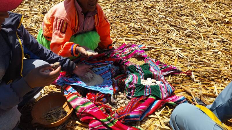 L’homme  va à la pêche et coupe la totora nécessaire à l’ile, la femme s’occupe des enfants, de la cuisine et fabrique les vêtements pour la famille ainsi que des objets pour les touristes, coussins, panchos, tapisserie....